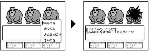 - RPGのモードのマップ上で遭遇するモンスターは、必ずしも3体ではなく、1〜3体の間になります。